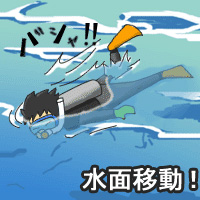 BCにエアーを入れた状態で水面を移動すること。ボートダイビングなどで、潜行するダイビングポイント位置まで移動する際に水面移動を行う。BCにエアーが入っていない状態で、水面移動しようとすると沈んでしまうので、水面移動をする場合には、しっかりとエアを入れておこう。